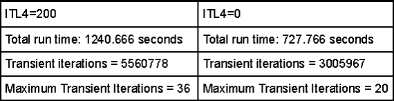 The second new feature is a novel way of using ITL4 in transient analysis. Recall that ITL4 is an option commonly used in SPICE-based simulators to control the number of iterations in each transient time point calculation. Up to now, ITL4 has been set by users to a large value (typically 100-500) in order to avoid the dreaded “time step too small” error in transient analysis. The problem with this approach is that it may result in making transient analysis unnecessarily longer than needed for most time points. Since the number is fixed, the simulator will scale back the time step after it has gone through that many iterations at every time point. This results in a long simulation run time.