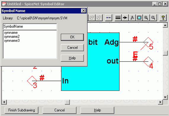| Prepare a schematic circuit configuration with only the circuitry that you want to include in the subcircuit. This means you must create a special configuration with the test circuitry and stimulus sources removed. You can use wires, test points or continuation symbols on the nodes that are unconnected. Unconnected nodes are shown as red diamonds. All unconnected parts must have their pins resolved with node numbers or names shown. If you want to pass parameters into your subcircuit then you need to copy your passed parameters to the parameters dialog for the configuration that you plan to export. These passed parameters will be added to the .subckt line for you. Select Make Subdrawing from the Subdrawings drop-down menu. The Subdrawing will be given a name that is the same name as the current configuration. You may change it in the Subdrawing Name: field if you want your part to have a different name. Click on the node from the list of nodes in the dialog that you want to expose from inside of the subcircuit (external connection that will be on the .SUBCKT line). Click the Add button to add the selected node to the list of subcircuit pins. Repeat this operation for each node you want to expose. You may arrange the node order using the Move Up/Move Down buttons. You can also assign the pins to be hidden. You will then be able to make connections to the hidden pins by using a continuation symbol with the same name as the hidden pin. The hidden pin name is assigned inside of the Parts Properties dialog. If you use the symbol wizard to create your own symbol then remember to save your symbol before you click on the Finish Subdrawing button at the bottom left of the symbol editor. Also don’t add the symbol to an existing symbol that Intusoft provides or it will be overwritten when you update the software. We have created a special folder to contain user-generated symbols: (C:\spice8\sn\mysym). If you save your symbol to ..\sn\mysym\mysym.sym then you won’t have to do anything. If you save the symbol to a different symbol file then modify the c:\spice8\sn\sym.@@@ file to include the path to your new symbol file.