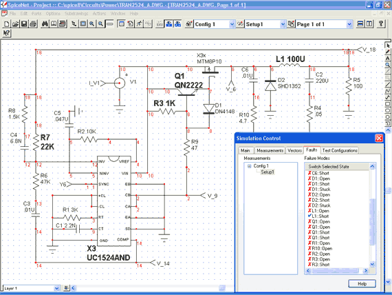 Introduction Through the decades the design automation industry has touted accurate simulation of electronic products from concept to production readiness. SPICE simulation for analog and mixed-signal circuitry has been no exception, including its unique ability to mold designs for production compliance. Analyses like Monte Carlo and worst-case simulation mimic variations in real-world component tolerances on a design, so it can be tweaked for acceptable performance. Such variation is valuable because it cannot otherwise be performed with a lab prototype board or production unit. But establishing good design margins is not the only factor that helps ensure a product's performance merit. What happens when a part goes sour in the field, such as a short, open or stuck-at value, or if a power supply faults? What effect could this have on a product's end use? The product designer should be privy to end-use risk (i.e., security monitor, backup power system, automobile ABS), but the cause and effect of failed parts is something that's best scrutinized early in the design process, not in the field. Historically, digital simulators have provided fault diagnosis to analyze the outcome of component failures, viewing the effects that faulty devices inflict on critical design signals. Today, such automated capability is also available for analog-based design (and with mixed digital) by way of Intusoft's automated fault simulation. Traditionally without this capability, a designer had to employ any number of tricks to painstakingly insert circuit faults. A super-high resistance value (i.e., 1G ohm) could be inserted as an open condition, or a wire might be inserted in place of a component to impose a short. A certain value might be temporarily assigned to a transistor's temperature coefficient to force "stuck at" condition, or an "open" from base to emitter. Manually inducing thorough fault coverage in this fashion could take days-to-weeks to setup and simulate, including the need to track an immense amount of alteration to the design database. Automated fault coverage on the other hand spares the designer from this lengthy and impractical task. In short it provides a convenient means of first assigning pass/fail limits to components' electrical properties (i.e., max power, RMS voltage, transistor collector current, rise time, propagation delay, etc.). Signal variation limits are similarly prescribed for desired lines. Then, shorts, opens and "stuck at" values are assigned to passive and active devices, as well as faulty levels for device temperature and power supply sources. After enabling any number of these conditions, fault simulation is run. Resulting electrical measurements are automatically recorded for desired components and signals lines, including readouts that chart numerical data and pass/fail results. Fault Simulation Setup and Implementation You prepare a fault simulation (in time or frequency domain) by assigning fault conditions to any device (Figure 7). A type of fault can be prescribed in a "failure mode" dialog box for a part (or optionally all "like parts"), as well as power sources and device temperature. Next, Figure 8 illustrates a one-fault setup for a UC1524 advanced regulating PWM controller circuit. Using the mouse, L1 is enabled as "shorted" amongst a vast collection of other possible faults that were assigned throughout the design. The engineer also selects which electrical properties of the design to monitor during a fault run. Several signals and devices were selected in Figure 9 for monitoring their "initial value" post a fault simulation. A variety of other selectable measurements are provided in the list. The fault run (time domain) was prescribed over a 1-millisecond period. Figure 10 illustrates the resulting measured "initial value" readings, including pass/fail. However, min/max est limits have not yet been assigned.
