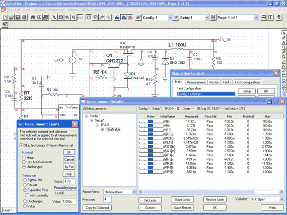 The top five fault selections in Figure 12's list are enabled (corresponding labels put in bold text on the schematic). After simulation, these faults can be randomly selected from the "Variation" menu as shown, to quickly view corresponding changes in the measured readouts on the left. Figure 13 provides a breakout of the "initial value" devices and signals on the left, showing the measured data (right) that the four enabled faults produced for the selected signal V(18). All of these features provide a fast "what-if" analysis of how faults affect critical devices and signal lines. Also shown are thumbnail simulation waveforms that display in real time during fault runs, with V(18) in the low left corner. Establishing Design Test Limits Establishing electrical test limits for devices and signal lines can be achieved in a number of ways. One method of course is to assign them per the designer's discretion. Other ways make use of acceptance criteria from product specifications and component datasheet ratings (i.e., device maximum power). For limits on signal lines, a designer can also run a Monte Carlo statistical analysis, which randomly varies component parameters through their tolerance range, then examines variation on signal lines. Once the circuitry is tweaked enough where variations are acceptable, the range can be used to establish pass/fail signal limits for fault simulation. Such limits are prescribed within the "Set Limits" dialog box for convenience. For example, the (left dialog) in Figure 14 provides a number of ways to open the min/max test limits to accept all measured readings under the present fault at hand (i.e., Q1 open). Sigma limits could have been selected if a previous Monte Carlo run was administered. The "Expand to Pass" option was chosen. Corresponding colored histograms to the right reflect the new "passed" measurements (green). This is useful for quickly studying test limit compliance with successively selected faults, that is, seeing how other faults' measured results comply with the relaxed test limits. For example, when the "R7 stuck" fault was next selected (Figure 15), some of the histograms changed color (failed) despite the new "expand to pass" test limits from Q1 open. Corresponding measured data is also shown. Conclusion Knowing how a design will operate under faulty conditions can be examined early in a product’s design-simulation phase. Historically SPICE tools have provided powerful ways of varying component tolerances and temperature to study signal variation for manufacturing compliance. This method and other means can also be used to establish pass/fail criteria for acceptable operation under fault conditions. In the end, design safeguards can be incorporated early in the design cycle to help eliminate possible damage from faults encountered in production and in the field.
