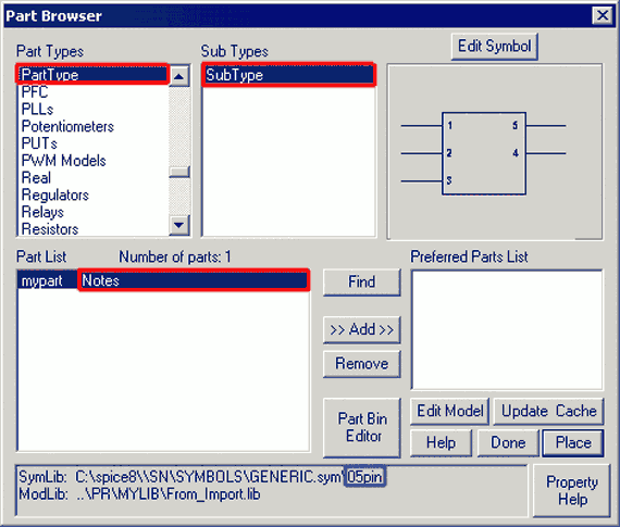 If you bring up the hierarchical Graphical Parts Browser you will find the recently imported part under PartType then SubType. You will want to move your part so it is under one of the existing categories. Use the Edit Fields buttons at the top left corner of the Library Manager dialog to change the text shown in the part browser. If the text is the same as an existing category then it will be placed in that category. Further, instead of using a generic box symbol, a more appropriate existing symbol can be used. First select a similar existing part in the part browser and look at the symbol name shown at the end of the SymLib: line, located at the bottom of the part browser. Then in the Library Manager click the "symbol" button and type the existing symbol name. Changing the *SRC= or *SYM= line will flag Library Manager to ask if want to perform an "update part database" when you try to close the dialog. This is necessary so your changes will ultimately be found in the part browser. If Library Manager launches Makedb, it will automatically close the part browser and re-open it with the new updated part database after it is done compiling. If the vendor who provided this part revises it, you can then re-import the part. Your modified *SRC= and *SYM= lines will not be changed. You will see a character by character diff and know exactly what was changed between revisions. |