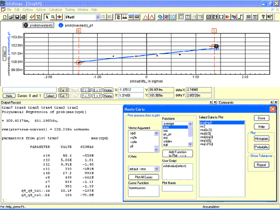 For customer training logistics and cost please call Intusoft at: 310-952-0657. For both new and existing users of ICAP/4 and Test Designer there are innumerable features and techniques for heightening your design's reliability and speeding the design cycle. It's almost impossible to know every aspect of the software, as it is incredibly extensive in its capability. You may have never run a worst-case analysis on your design, or used the innermost features of a Monte Carlo statistical analysis. New users may not know the power and advantage of the blue IsSpice4 window environment that comes to view during a simulation, and so on. Following are a few tips to help make most use of your ICAP/4 tools. Tutorials, Manuals and Books For new users, look at your Help pulldown menu in the SpiceNet design-entry window. Here you will find under "New User" one or two New User's Tutorials. The more advanced tutorial is provided with ICAP/4Windows and higher offerings. Be sure to go through these to get a fast “readers digest” roadmap to quickly becoming familiar with the entire design entry through production-readiness flow. With the first tutorial you’ll be able to use the tools with enough proficiency to enter designs, simulate, view waveforms, and gain proficiency with other helpful functions.With the second tutorial you will perform more advanced operations within SpiceNet and IntuScope, plus set up electrical measurements with pass/fail limits, run Monte Carlo statistical analysis, parametric component sweeps, and add a new SPICE model from the internet. Monte Carlo "Report" Option Monte Carlo statistical analysis is used to randomly vary component tolerances throughout their tolerance range, as any desired amount of simulations are run varying the tolerances each time. Running the "Monte" simulation script for SpiceNet's "Simulation Control" dialog produces a family of curves, histogram bar-graph plot, and probability density plot of the simulation results. A probability density plot shows the measurement value (i.e., voltage at Vout), verses the deviation (in sigmas) from a 0% tolerance variation. Also located in the "Monte" dialog from IntuScope, is a "Report" box (option). After a probability density plot is made, if the Report box is selected, then in the SPICE output file and in IntuScope's "Output Record" window the actual component values are displayed for the Monte Carlo simulation run. For example on your Sample2.DWG drawing, a Monte Carlo simulation was run for 6 cases (runs). Following is the probability density screenshot and results from the report option. The design signal selected for data recording is vpd and the function is maximum voltage.