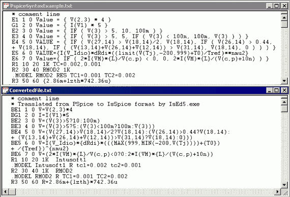 Pspice-to-IsSpice Converter Many SPICE models are available in Pspice format. The majority of the analog syntax for both IsSpice4 and Pspice is exactly the same, but there are a few small differences that would make the Pspice model inoperable in IsSpice4 until it was translated to proper syntax. A manual conversion could be done, but this would take time and is error prone. Intusoft has created a Pspice-to-IsSpice4 Converter that instantly changes the analog Pspice netlist into a format used by IsSpice4. Simply open the Pspice netlist file in IsEd, or paste it in a blank IsEd window. From the edit menu select “Convert Pspice to IsSpice” or press the <Ctrl>+I hotkey. Another window will come to view with the netlist converted to IsSpice4 syntax. Note that the converter works on analog parts only. No Pspice digital parts will be translated. Not all Pspice models can be converted though we welcome any modeling conversation recommendation from users.