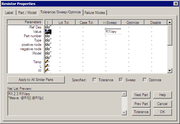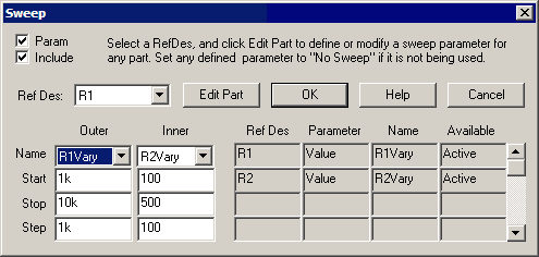 In this analysis, (actual Sweep.scp file), you need to identify the parameters you want to sweep symbolically, for example R1Vary, using the Tolerance/Sweep/Optimize tab for the appropriate part properties. Enter the sweep variable name under the Sweep column on the same row of the parameter you want to sweep. You can use the same sweep variable for multiple parameters. For example if you enter the same sweep variable name for multiple resistors value then they will be swept as a group. You can disable a sweep variable by clicking under disable column across from the sweep variable you want to turn off. You can sweep 2 sweep variables during simulation, one for outer loop and the other for an inner loop. This works like the DC sweeps built into IsSpice, except with the sweep template you are not limited to a DC analysis.