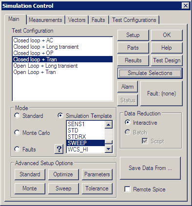 Using the Simulation Control dialog, click on the Sweep button at bottom of dialog under Advanced Setup Options section. Fill in the Start, Stop and Step fields using Spice numbers (1u, 5m, …). The Name field should be the one you assigned earlier, as illustrated using R1Vary. As in the Monte Carlo template, you can make measurements before and/or after running the simulation. For a single parameter sweep, use the Outer Sweep.