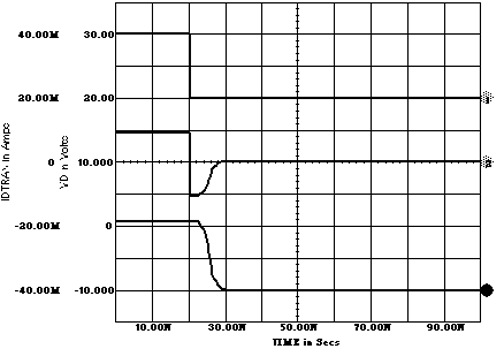 Initially, the test circuit is set up in a default configuration suitable for most diodes. The type of diode and its ratings will dictate if you need to modify the SPICE voltage or control statements. Note For Library Manager users: With Library Manager, you can preview and test your circuit and your model listing will be updated automatically. Note For other ICAP/4 users:If you do not have Library Manager, you must first delete the DUT device and insert the device you want to simulate, in this case, the 1N4148. To do this you MUST first get the model into the SpiceNet database. This is accomplished by putting the library file containing the model into the SPICE8\PR directory, if it is not already there. Then you must update the SpiceNet database by selecting Update Database from ViewDraw's File menu. See theSpiceNet on-line help for more information. If you are using any another SPICE program, you will have to retrieve the .MODEL statement from the model library file where it was saved and place it into the DIODETST.CIR netlist using a text editor before a SPICE simulation can be run. The DIODETST.CIR should produce the results shown below.